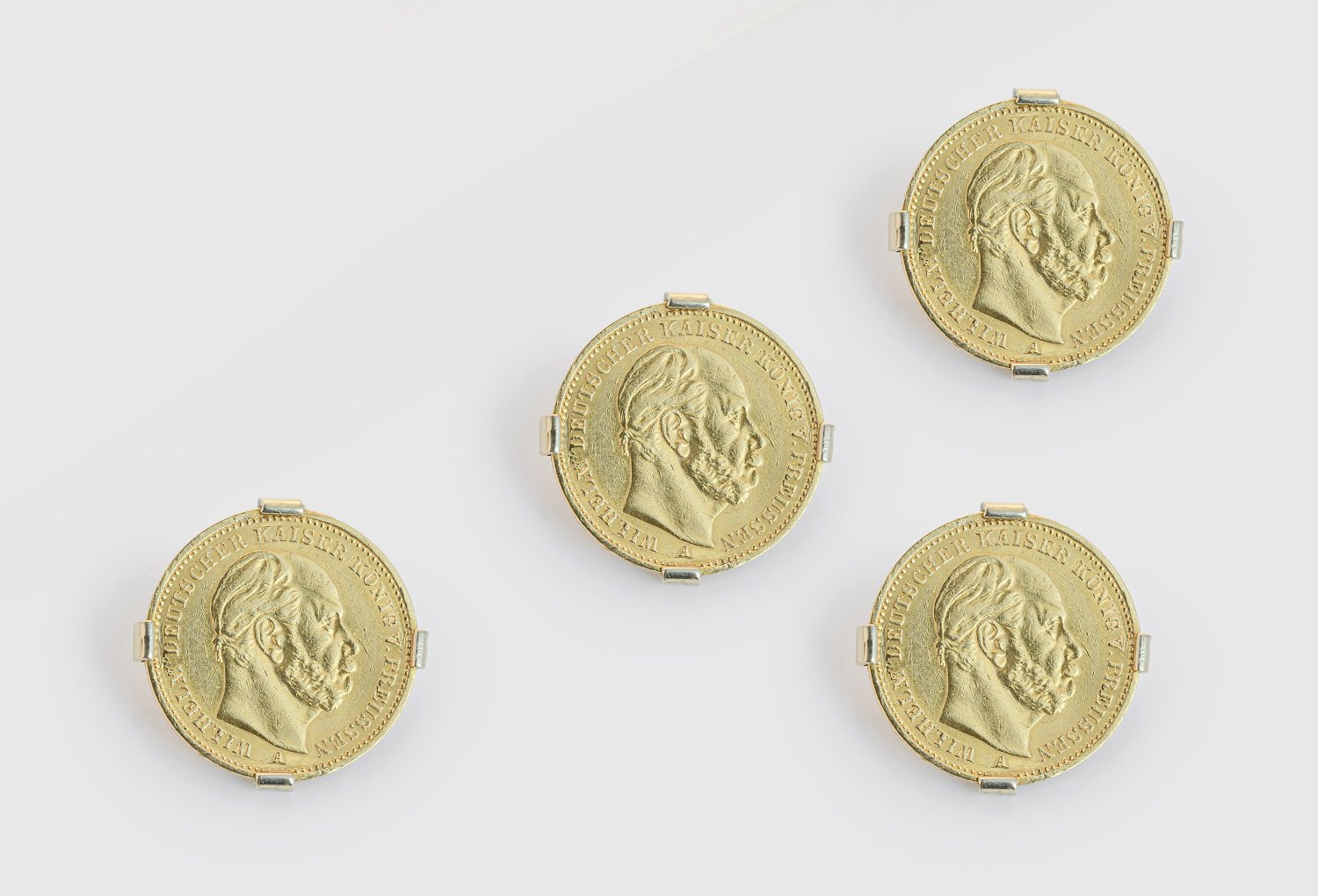 Gelbgold, 21,6 k. Zentral besetzt mit vier 20-DM-Dukaten-Münzen mit erhabenen Porträt im Profil von Kaiser Wilhelm und König von Preußen. Ges.-Gew. ca. 40,60 g.