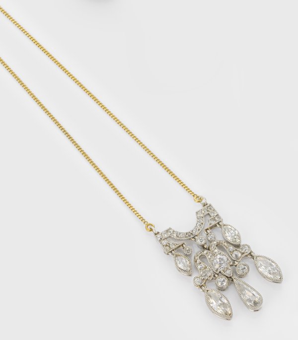 Weißgold 18 k und Gelbgold 14 k. Schauseitig besetzt mit einem Pearcut-Diamanten von ca. 0,75 ct., 4 Diamant-Navetten von zus. ca. 0,75 ct., 3 Altschliffdiamanten von zus. ca. 0,25 ct. und 8/8 Diamanten, umzogen von feinen Millegriffbändern, an feiner Panzerkette. L. 40,5 cm. Gew. ca. 6,76 g.