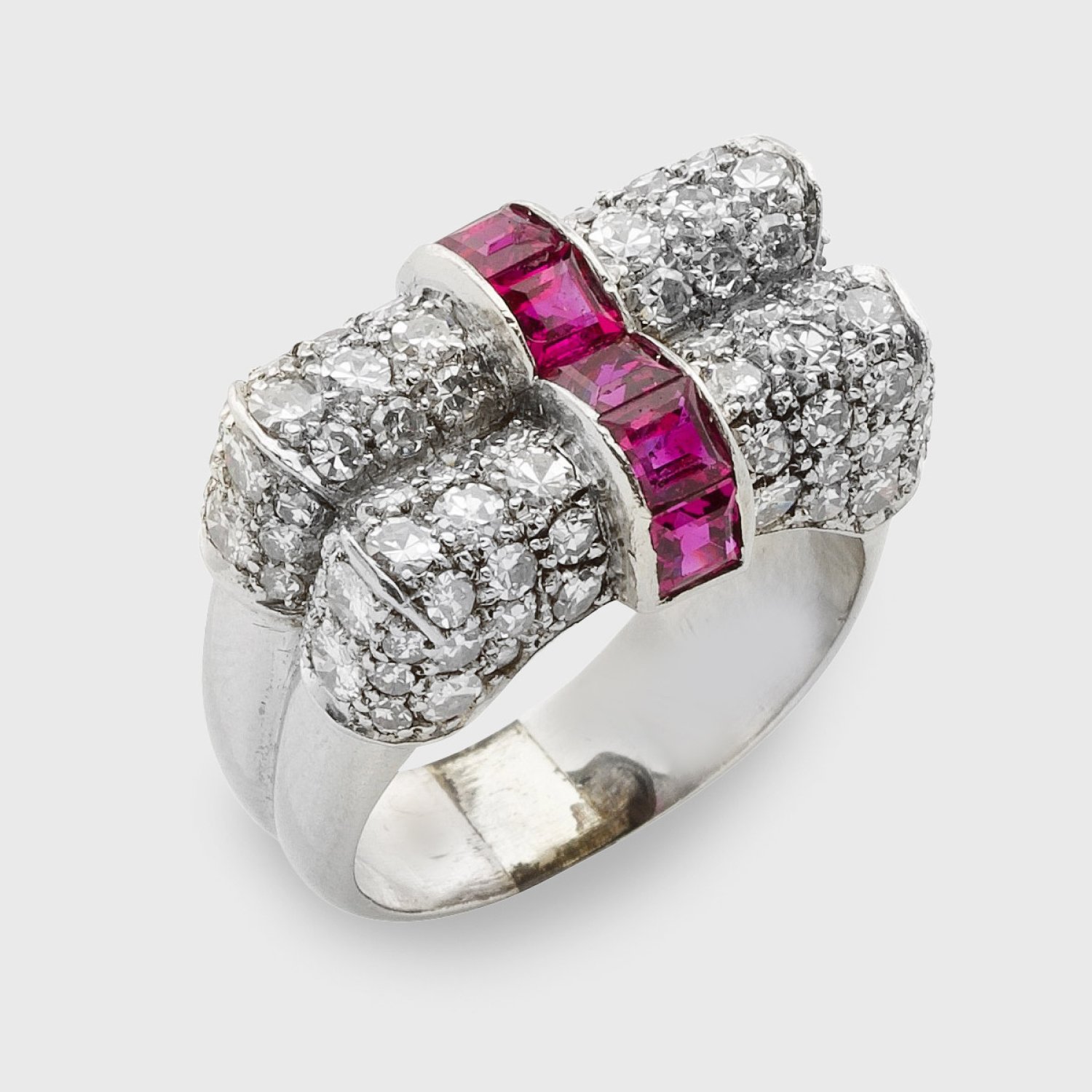 Platin. Schauseitig ausgefasst mit taubenblutroten Rubin-Carrées von zus. ca. 0,90 ct. und 8/8 Diamanten von zus. ca. 3,50 ct. Gew. ca. 14,09 g.