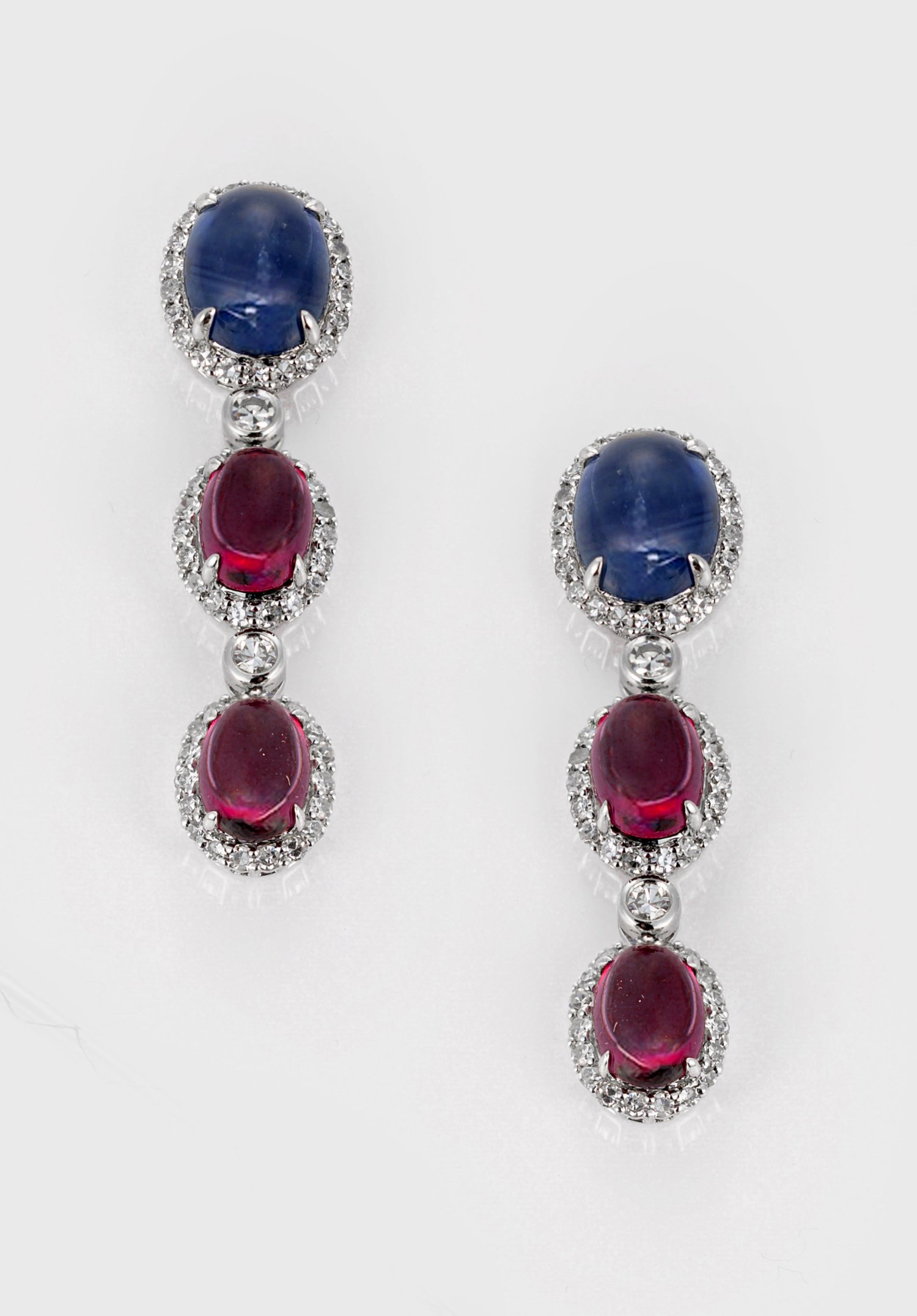 Pair of earrings set with rhodolithes approx. 5,20 ct., sapphires approx. 5,90 ct. and diamonds approx. 1,00 ct. (G/si), in 18 k white gold.