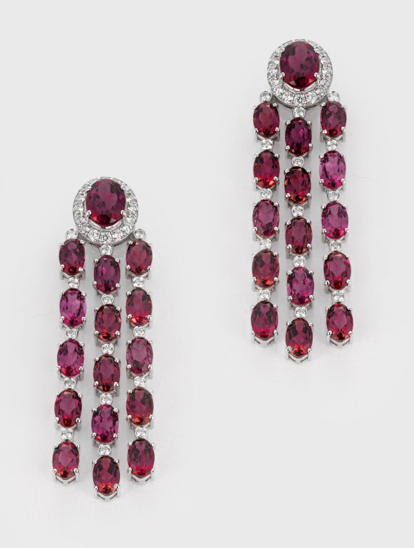 Pair of earrings set with raspberry tourmalines approx. 16,34 ct. and diamonds approx. 1,06 ct., in 18 k white gold.