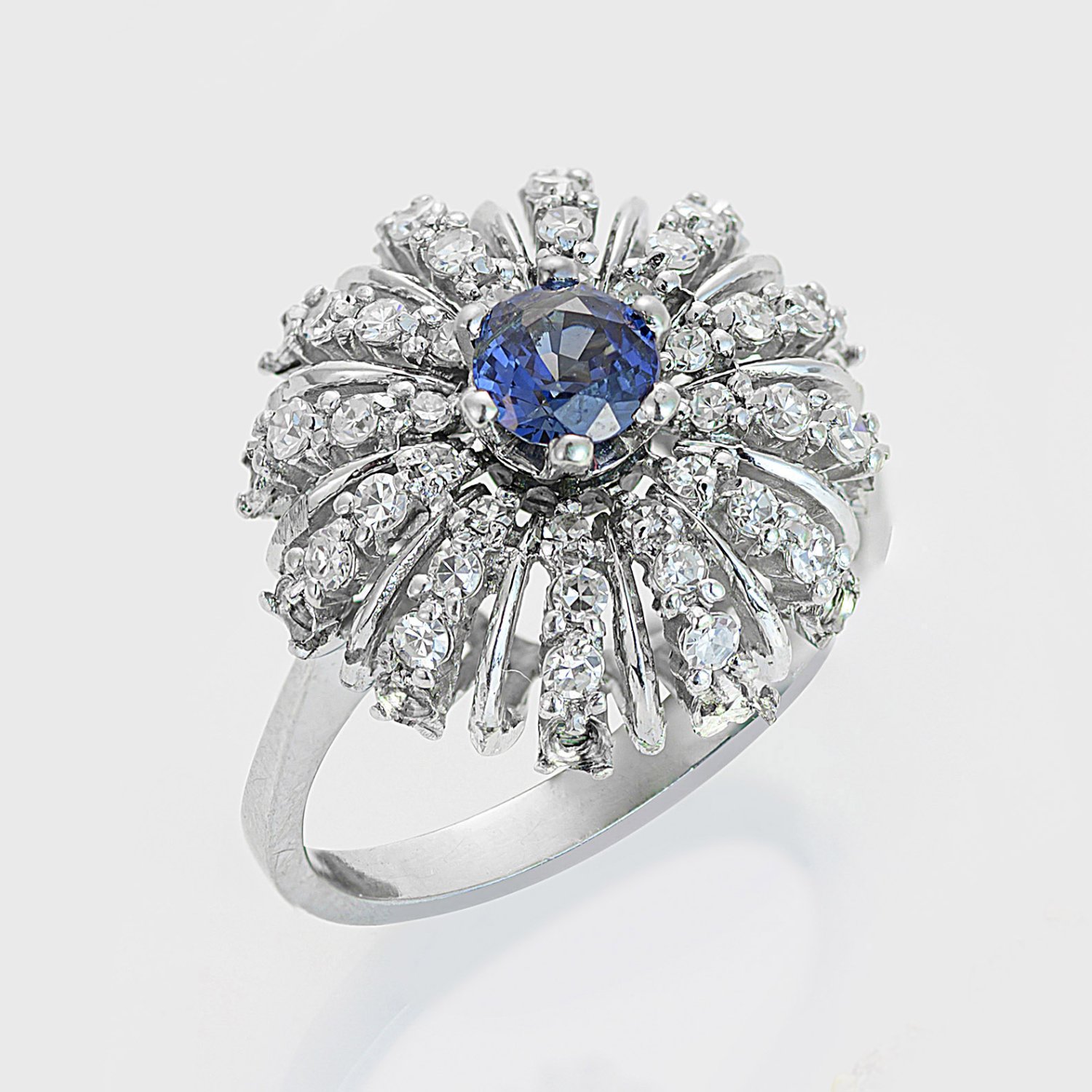 Weißgold, gest. 750. Blumenförmiger Ringkopf in Ajour, besetzt mit einem nahezu kornblumenblauen Saphir von ca. 0,50 ct. entouriert von 8/8 Diamanten (untere Reihe fehlt). Gew. ca. 6,60 g.