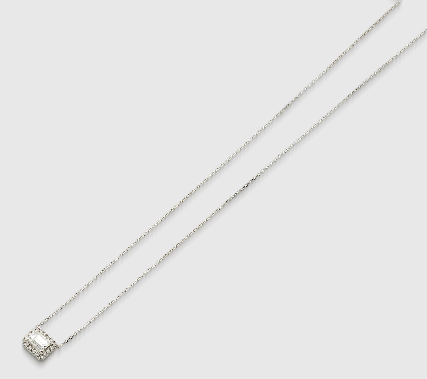 Weißgold, gest. 750. Schauseitig besetzt mit einem Diamanten von ca. 0,40 ct. (F/vs2) im Radiantschliff und Brillanten von zus. ca. 0,15 ct. (F/vvs), an feiner Ankerkette. L. ca. 45 cm. Ges.-Gew. ca. 3,05 g.