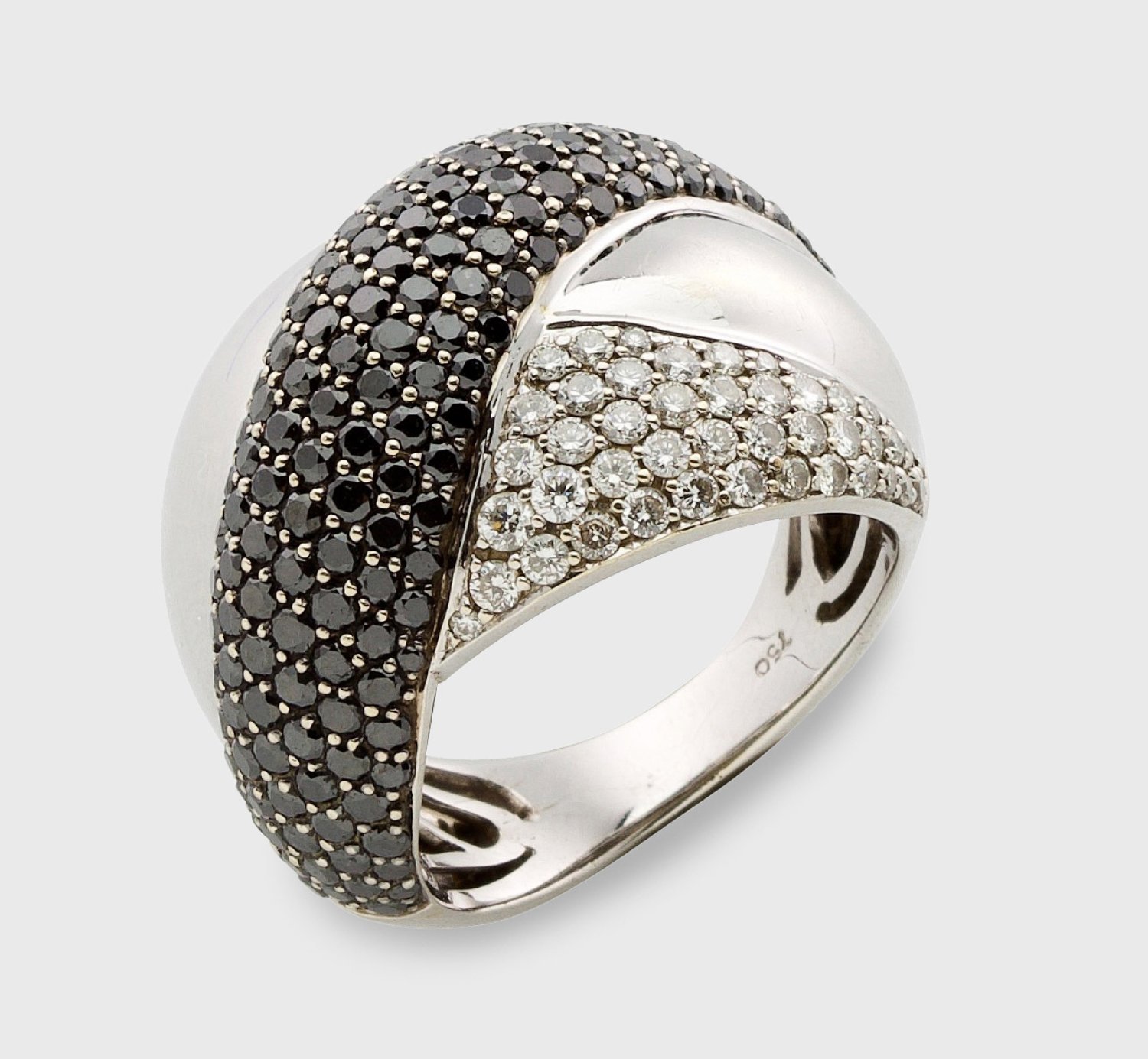 Ring set with black and white diamonds of approx. 3,50 ct. in total, in 18 k white gold.