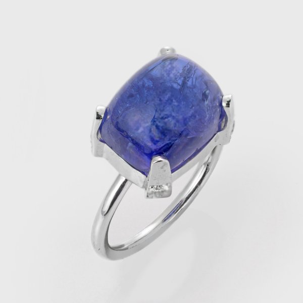 Platin. Zentral besetzt mit einem violettblauen Tansanit-Cabochon von ca. 14,96 ct., flankiert von vier Brillanten von zus. ca. 0,25 ct.; Gew. ca. 9,10 g.