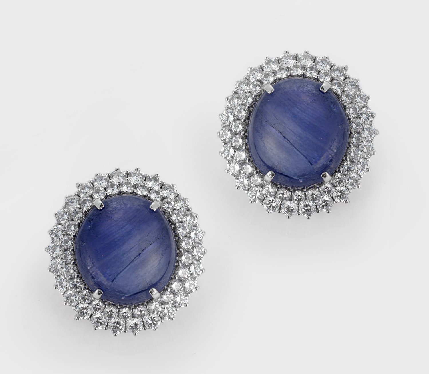 Weißgold, gest. 750 und Platin. Zentral besetzt mit zwei unbehandelten, royal blue Burma Sternsaphir-Cabochons von zus. ca. 35,50 ct., entouriert von Brillanten von zus. ca. 4,70 ct. Ges.-Gew. ca. 24,95 g.