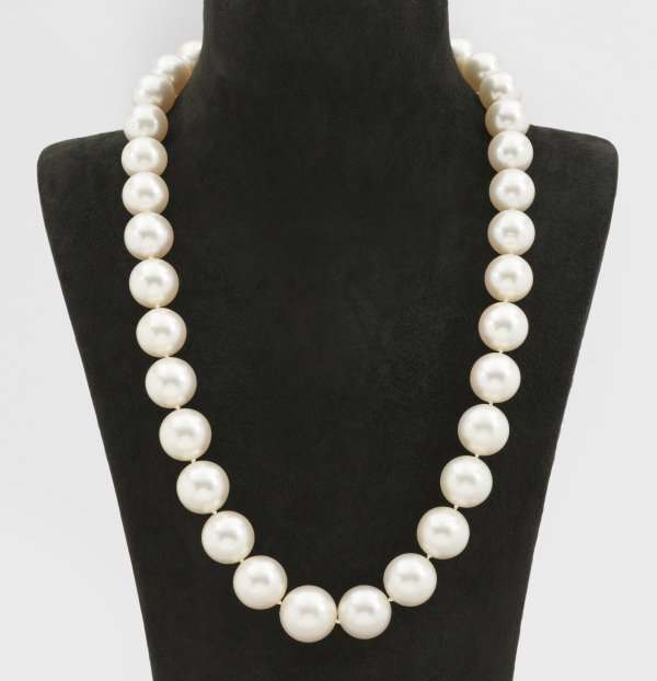 Gelbgold, gest. 585. Leicht verlaufende, einreihige Kette mit cremefarbenen Südsee-Perlen von ca. 12 bis 16 mm, in sehr feinem, rosé-grün changierendem Lüster. Schließe besetzt mit Brillanten. L. ca. 51 cm. Gew. ca. 128,69 g.