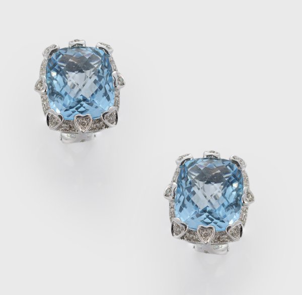 Weißgold, gest. 585. Zentral besetzt mit jeweils einem himmelblauen Topaz von ca. 12 x 15 x 8 mm im Briolettschliff, entouriert von kleinen Diamanten. Ges.-Gew. ca. 12,80 g.