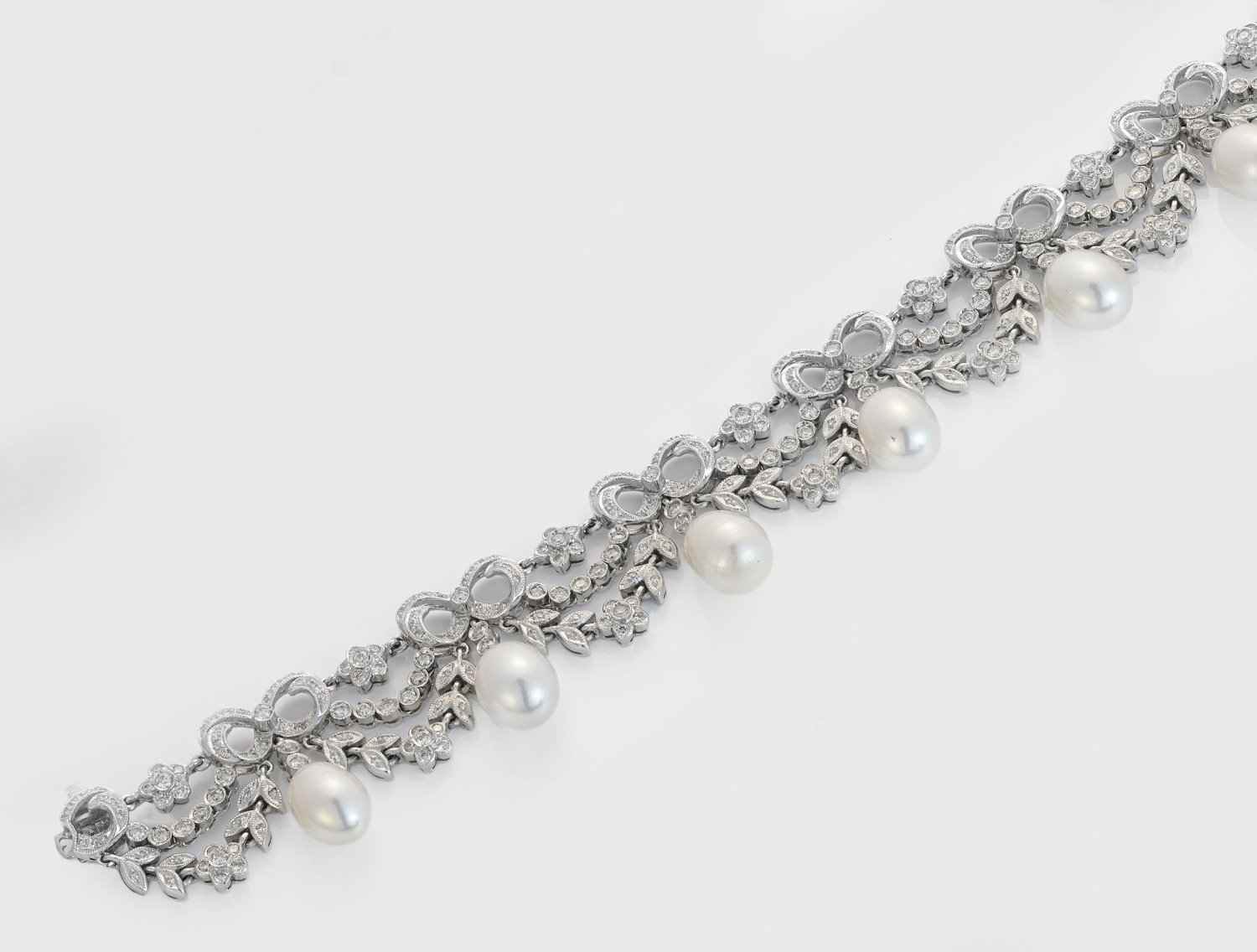 Weißgold, gest. 585. Feine Ajour-Arbeit mit Blüten, Ranken und Schleifen. Ausgefasst mit Brillanten von zus. ca. 3,40 ct. und weißen, tropfenförmigen Perlen von ca. 8 mm, in sehr farbintensivem, rosé-grün changierendem Lüster. L. ca. 18 cm. Gew. ca. 40,28 g.