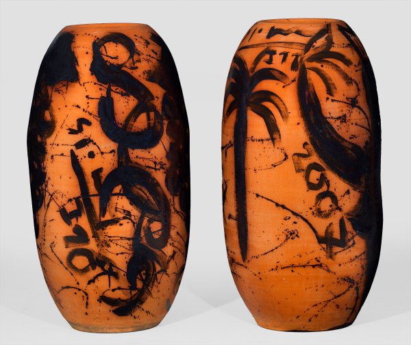 Keramik, teilw. schwarz glasiert. Balusterförmiger Korpus. Umlaufend der Wandung flächendeckend expressiver Dekor aus stilisierten Weinreben bzw. Palme und Stierkopf. Eine mit Künstlersignatur und bez. 2007. H. 100 cm.
