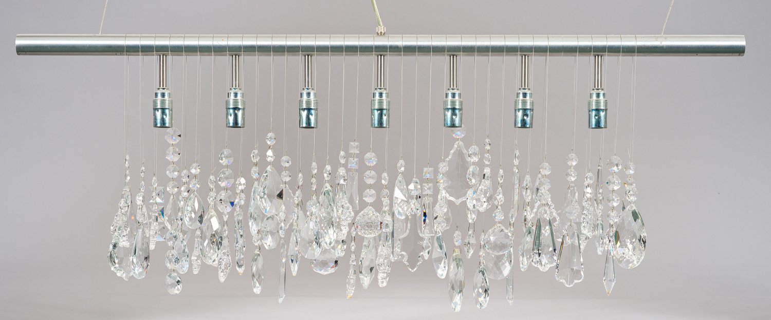 7-flg.; Aluminium und farbloses Kristallglas. Quergelegter Rundschaft als Träger für Leuchtmittel. Üppiger Behang aus asymmetrisch angeordneten unterschiedlichen Prismen. Elektrifiziert. Entw. Nunzia Carbone und Tiziano Vudafieri, 1996. L. 100 cm.