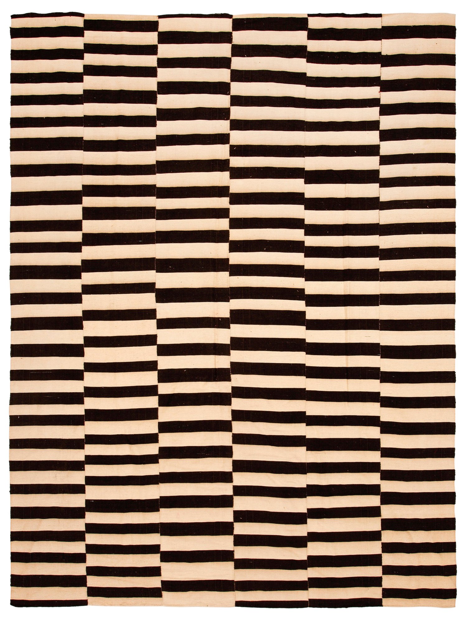 1960er Jahre Wolle auf Wolle flach gewebt. Flächendeckende Musterung aus schwarz-weißen Streifenbahnen im Versatz. 363 cm x 254 cm.