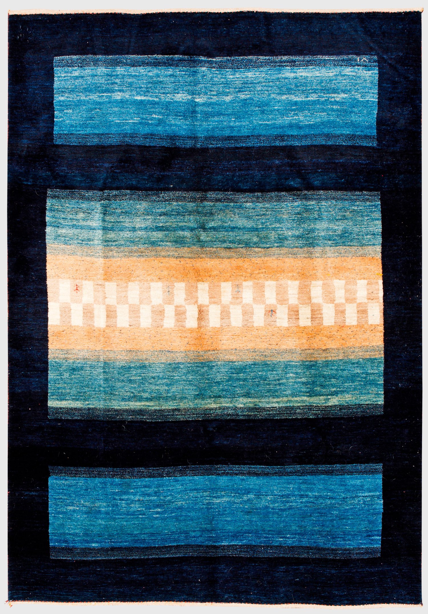 Persien. Wolle auf Wolle. Im Innenfeld flächendeckend abraschierte Streifenmusterung in unterschiedlichen Blau-, Grün- und Gelbtönen. Umlaufend breite, dunkelblaue Rahmung. 173 cm x 240 cm.