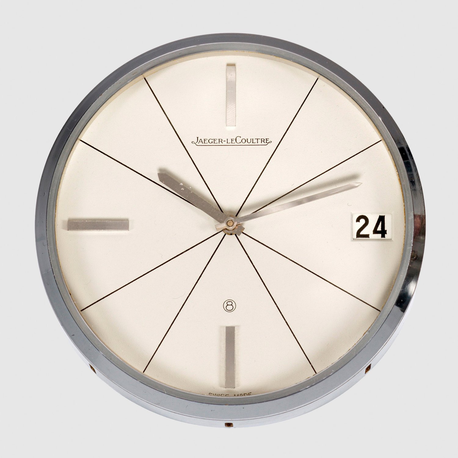 A Swiss steel table clock by Jaeger-LeCoultre.