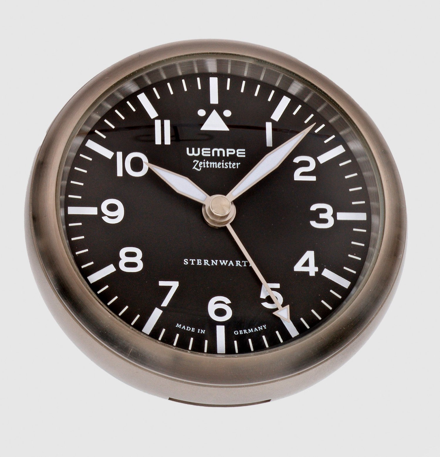 Stahl. Bombiertes Uhrengehäuse mit abklappbarer Basis. Verglastes schwarzes Zifferblatt mit arabischen Zahlen, bez. WEMPE Zeitmeister Sternwarte. Quarzwerk mit Weckfunktion. D. 8 cm.