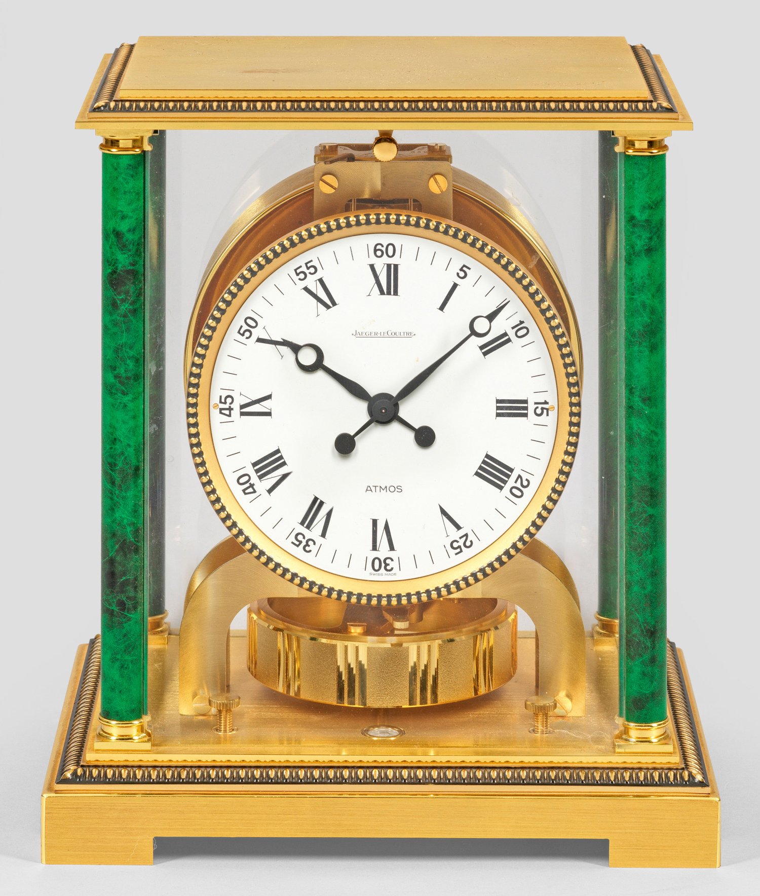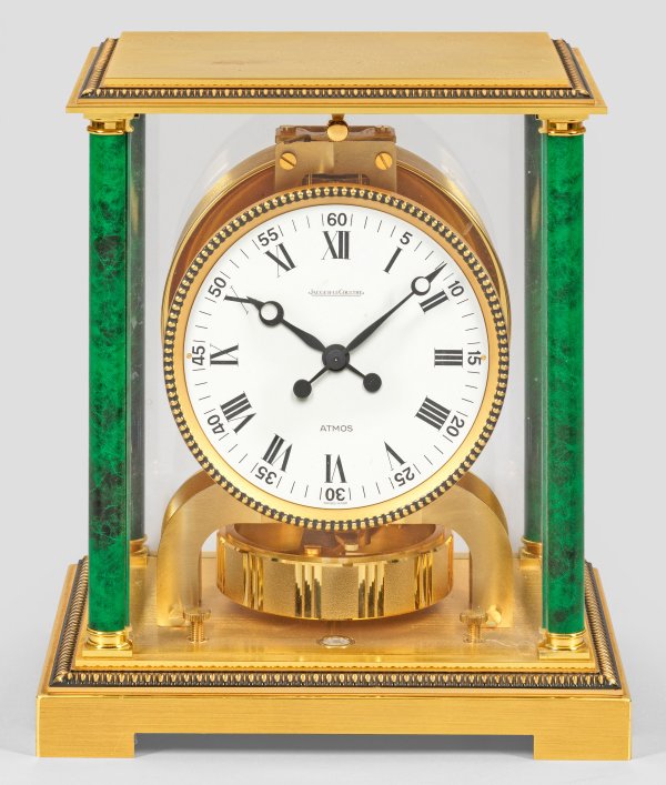 sog. "Pendule Perpetuelle". Vergoldetes Messing, teilw. in grüner Marmoroptik lackiert. Allseitig verglaster, rechteckiger Korpus aus eingestellten Säulen auf profilierter Basis. Von Perlstab gerahmtes Zifferblatt, Bez. ATMOS, Jaeger LeCoultre. Rotationspendel. H. 23,5 cm. 21 cm x 16 cm.