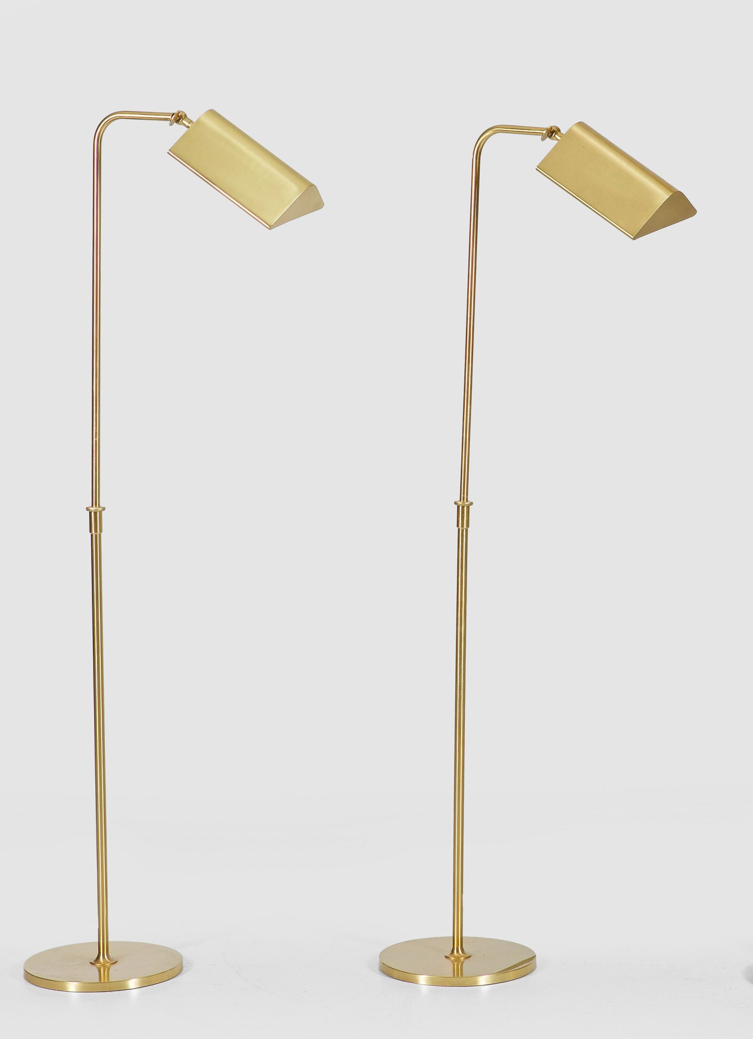 A pair of German brass floor lamps probably designed by Florian Schulz. Unmarked.