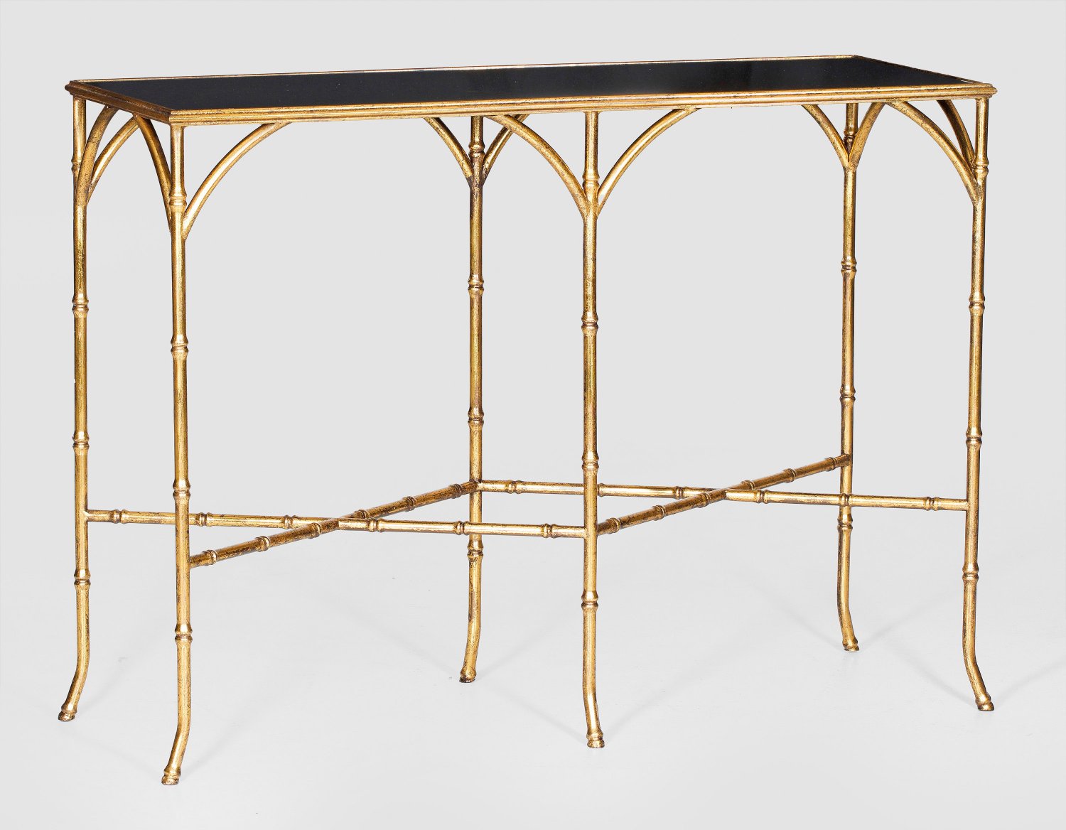 Metall, vergoldet und teilw. patiniert sowie schwarz hinterlegtes Glas. Schmale Zarge und leicht schräggestellte Beine aus sog. Fauxbamboo, unterhalb durch kreuzförmig angelegte Stege verbunden. Eingelegte Deckplatte. H. 82 cm. 112 cm x 38 cm.