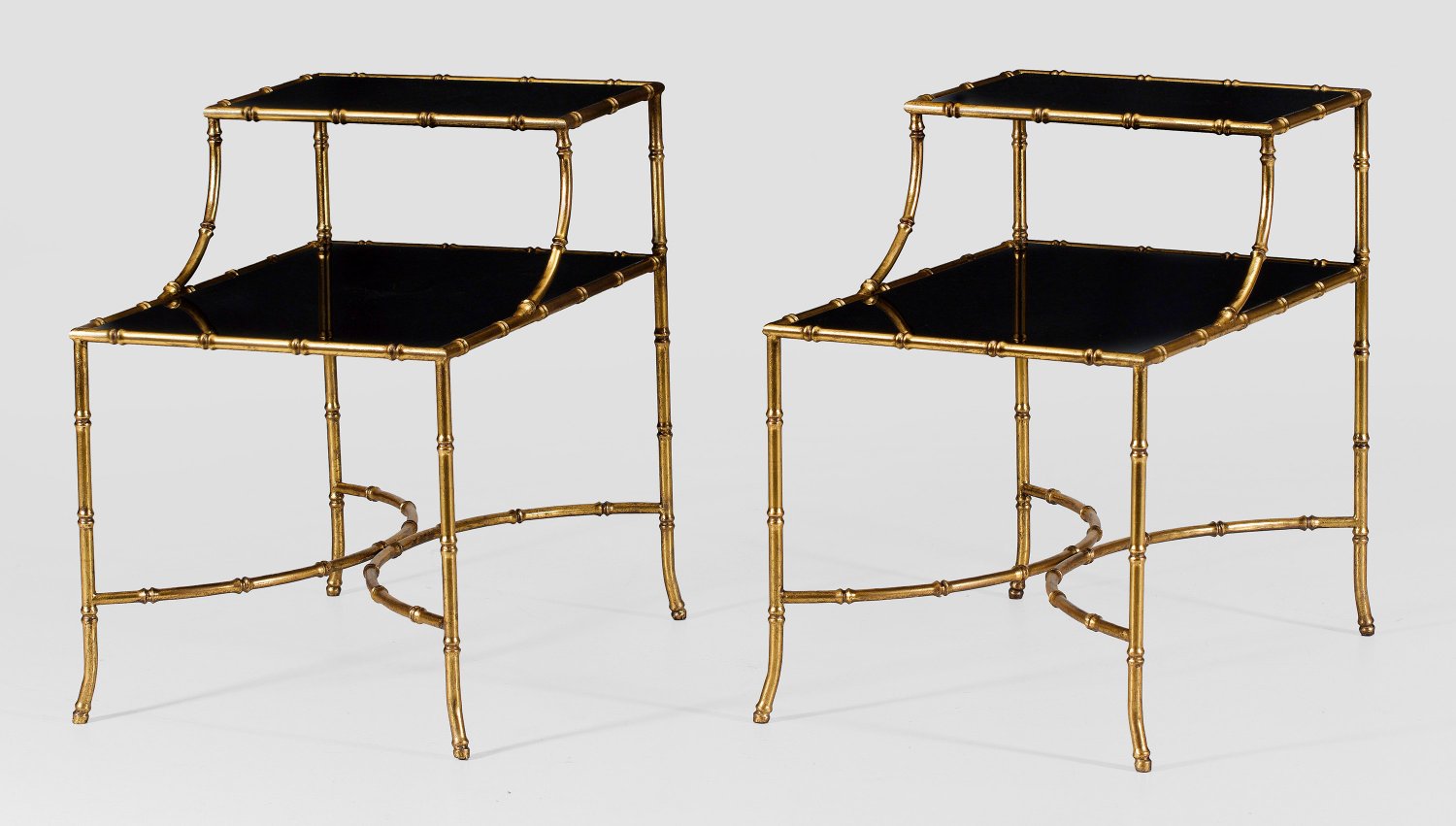 Metall, vergoldet und teilw. patiniert sowie schwarz hinterlegtes Glas. Schmale Zarge und leicht schräggestellte Beine aus sog. Fauxbamboo, unterhalb durch gebogte Stege verbunden. Korrespondierender oberer Abschluss. Eingelegte Deckplatten. H. 64 cm. 45 cm x 64 cm.