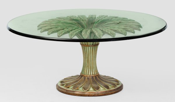 Holz, reliefplastisch gestaltet und seegrün gefasst sowie farbloses Glas. Über profilierte Basis zentraler Schaft in Form einer stilisierten Palme mit gestreckten Palmblättern als Träger für runde Deckplatte. H. 46 cm. D. 109 cm.
