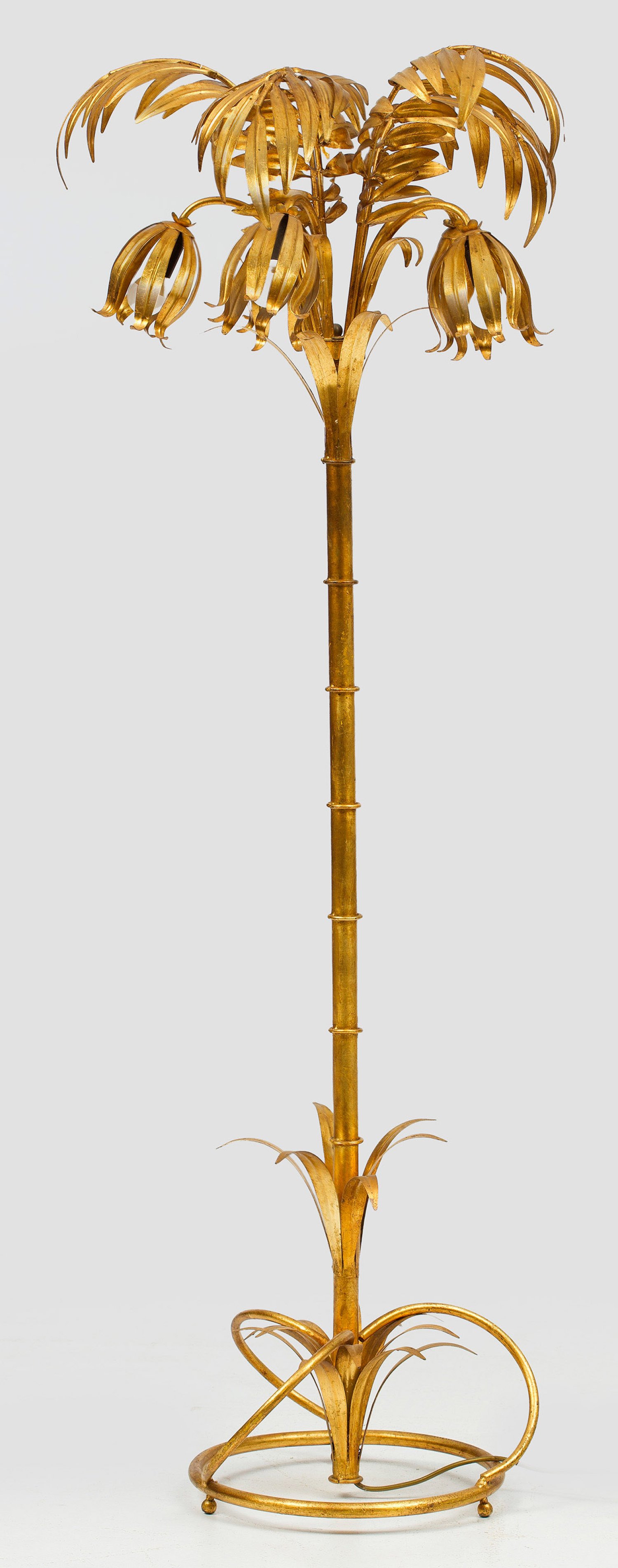 5-flg.; Metall, vergoldet. Über offen gestalteter Basis mit Blattwerk schlanker Rundschaft in Form einer stilisierten Palme mit Palmwedeln. Gebogte Leuchterarme mit blütenförmigen Leuchtmitteln. Elektrifiziert. Unbez.; H. 169 cm.