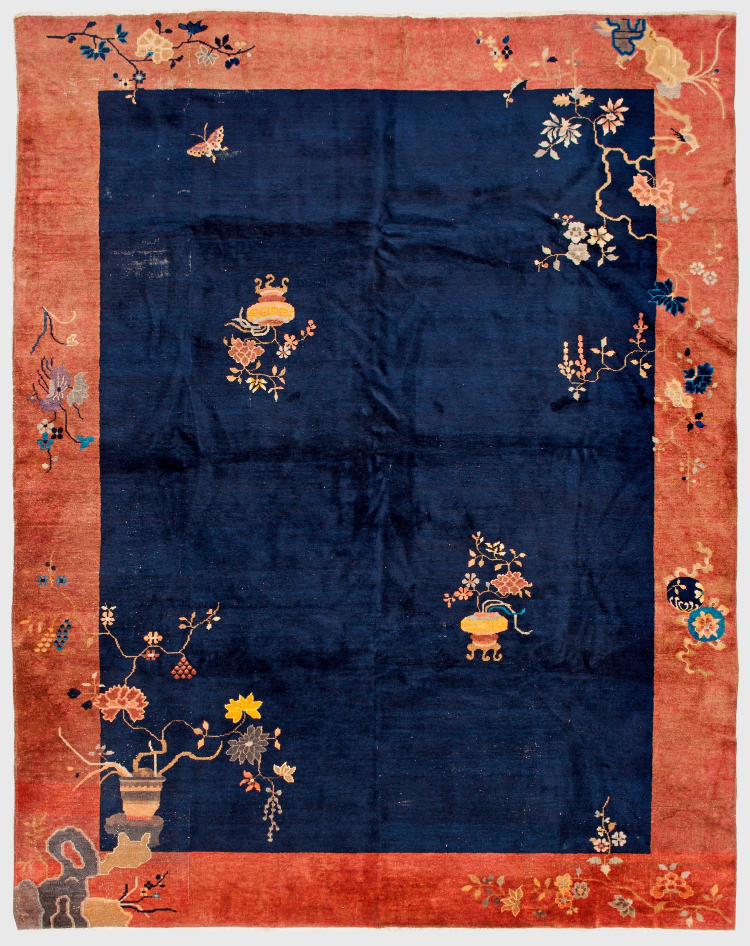 China. Um 1920. Wolle auf Baumwolle. Im tintenblauen Innenfeld Musterung aus gegeneinandergestellten Vasenmotiven und Schmetterling. Umlaufend breite, lachsfarbene Bordüre. In den Ecken große, unterschiedliche und in das Innenfeld ragende Blütenzweige. Beiliegend Gutachten von Freydoun Pakzad, 1998. 272 cm x 348 cm.