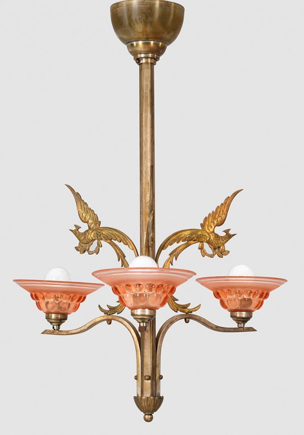 3-flg.; Messing, mit Resten alter Vernickelung sowie roséfarbenes Glas. Schlanker, gekanteter Schaft. Davon ausgehend durchbrochen gearbeitete Leuchterarme mit Paradiesvögeln als Träger für flache Lampenschalen. Elektrifiziert. H. 68 cm. D. 46 cm.