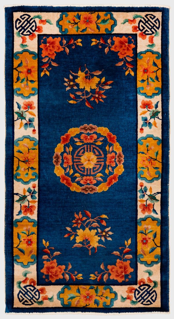 China. Wolle auf Baumwolle. Im blauen Innenfeld Zentralmedaillon aus stilisierten Blüten in unterschiedlichen Gelbtönen sowie Musterung aus losen Blütenzweigen. Umlaufend breite, elfenbeinfarbene Bordüre mit Shousymbolen und Blütenkartuschen. 148 cm x 76 cm.