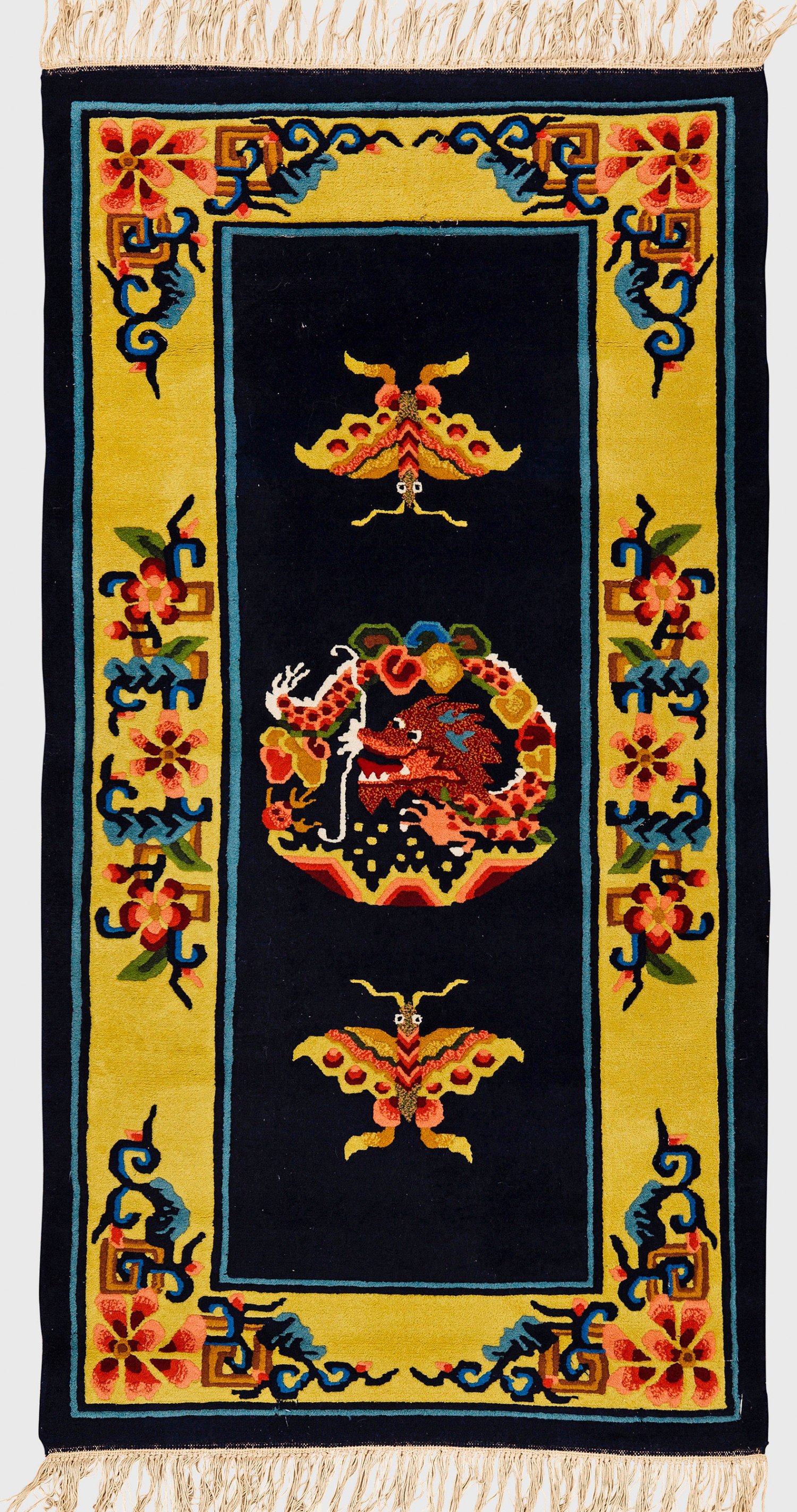 China. Wolle auf Baumwolle. Im nachtblauen Innenfeld zentrales Drachenmotiv, flankiert von zwei großen Schmetterlingen. Umlaufend breite, zitronengelbe Bordüre aus stilisierten Blüten. 182 cm x 96 cm.