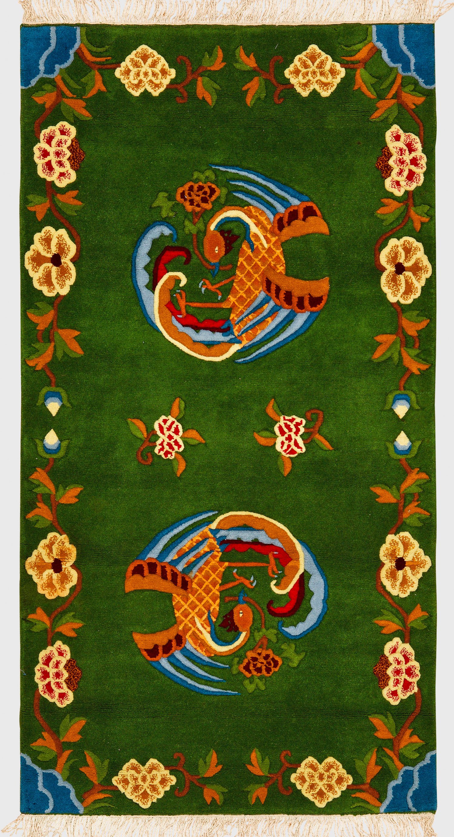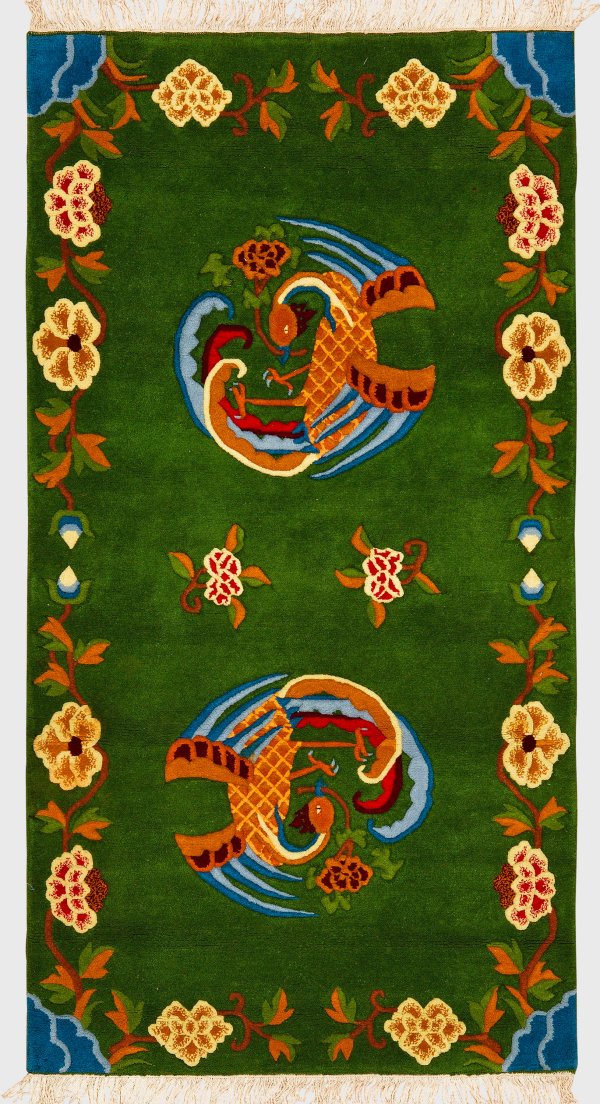 Nepal. Wolle auf Baumwolle. Auf moosgrünem Fond zwei Rundmedaillons in Form von Phönixen. Umlaufend offen gestaltete Rahmung aus stilisierten Blüten. 172 cm x 90 cm.