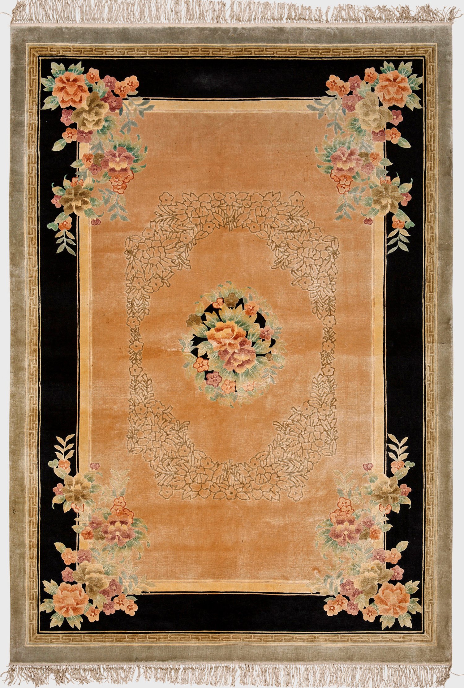 China. Seide auf Baumwolle. Im apricotfarbenen Innenfeld Zentralmedaillon aus Blüten, umgeben von stilisierter Rahmung in Hellgrau. Umlaufend breite schwarze Bordüre sowie schmales Mäanderband mit reichem Blütendekor in den Ecken. 242 cm x 168 cm.