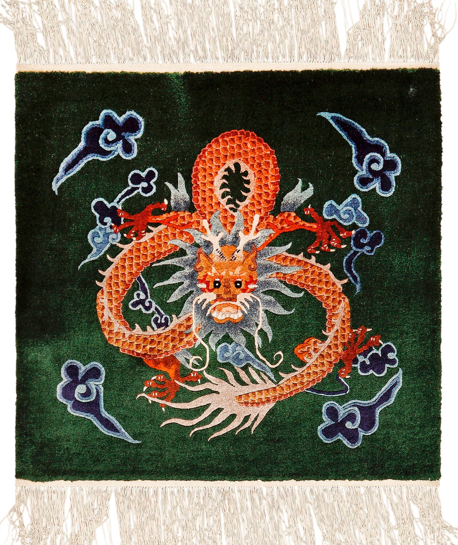 Tibet. Seide auf Baumwolle. Auf smaragdgrünem Fond zentrale Darstellung eines fünfklauigen Drachen, umgeben von stilisierten Wolken. 70 cm x 79 cm.