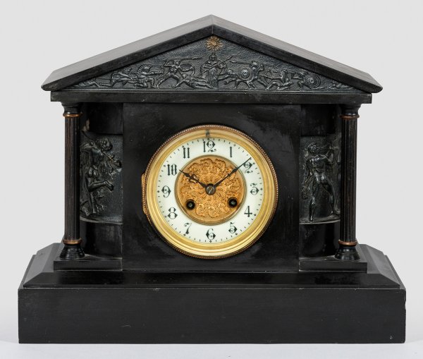 Schwarzer Marmor und schwarz lackierter Zinkguss. Über querrechteckig angelegtem Sockel architektonisch gegliedertes Gehäuse mit flachem Dachabschluss. Reliefplastisch gestaltete Figurenfriese. Verglastes Zifferblatt. Pendulenwerk mit Pendelfeder sowie Schlagwerk auf Tonfeder. Platine bez. Jules-Rolez Limited. H. 28 cm. 43 cm x 13,5 cm
