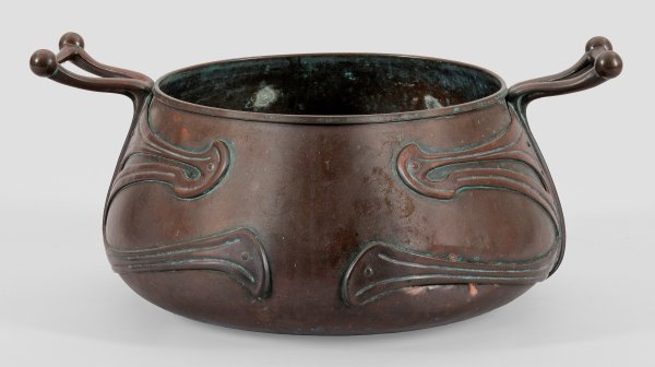 Kupfer. Bombierter, sich konisch verjüngender Korpus. Auf der Wandung erhaben reliefierter Dekor aus Arabesken, in kräftige, leicht geschweifte Griffe übergehend. Unbez. Altersspuren. H. 23,5 cm. Korpus-D. 40 cm.