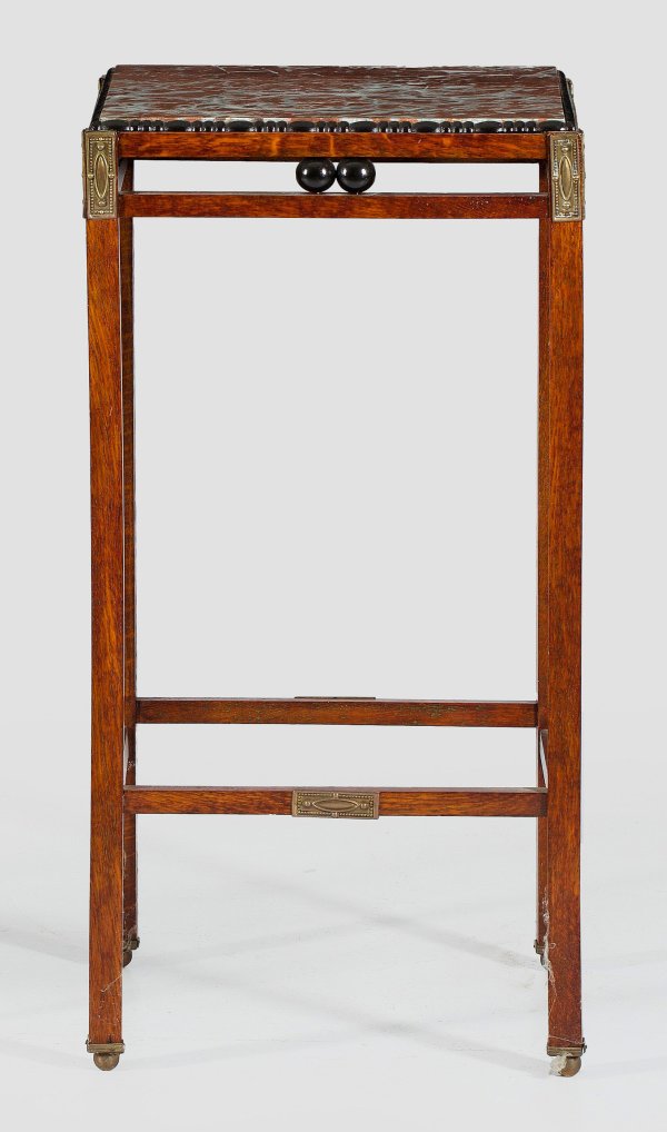 Eichenholz, mahagonifarben gebeizt. Offen gestalteter Korpus aus schlanken, gekanteten Streben und Stegen. Quadratische, profilgerahmte Deckplatte aus rotem, weiß gemasertem Marmor. H. 74 cm. 37 cm x 37 cm.