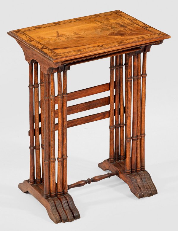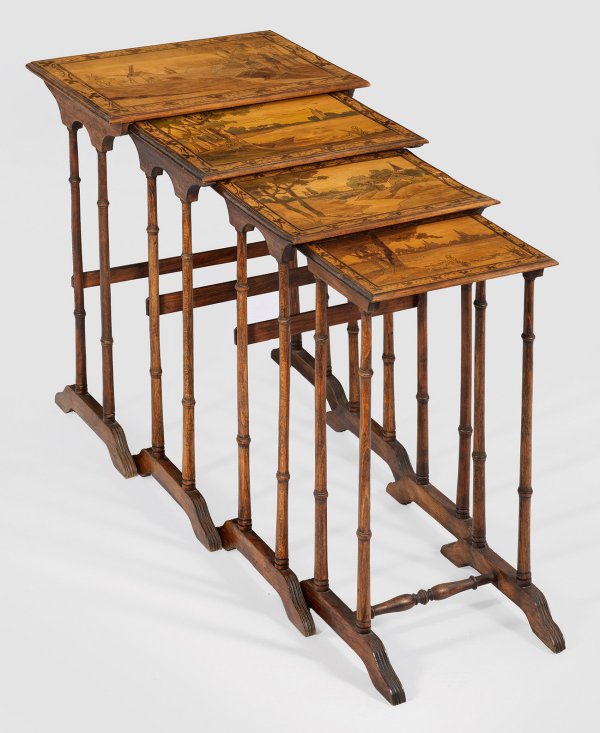 4-tlg.; Buchenholz und Ahorn, furniert. Über geschweift ansteigenden Kufen mehrfach gegliederte Balusterbeine als Träger für rechteckige Deckplatte. Flächendeckende Landschaftsdarstellungen aus, teilw. mit Beize akzentuierter Brandmalerei, begrenzt von Ornamentbändern. H. 66 cm/72 cm. 36 cm x 24,5 cm/56 cm x 39 cm.