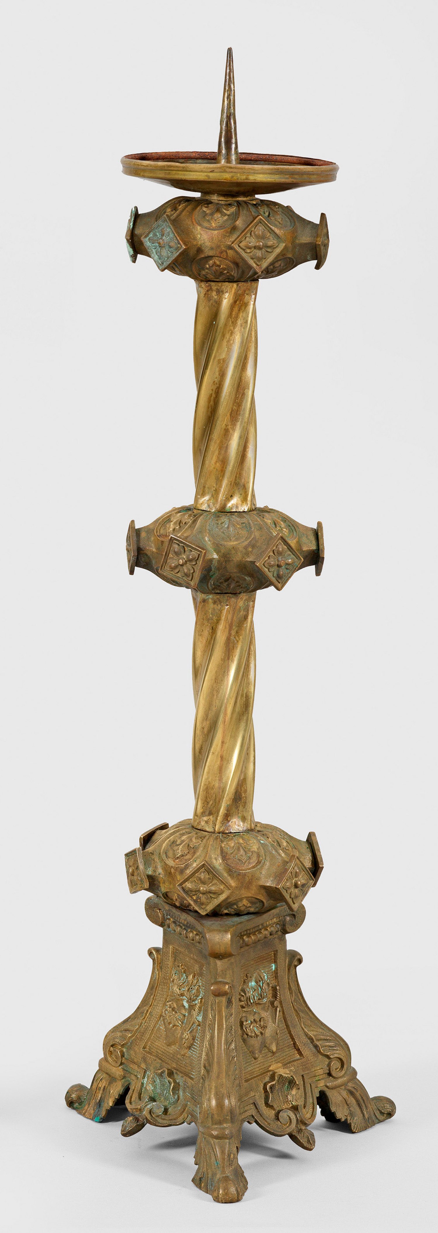 1-flg.; Messing. Über drei Volutenfüßen und dreiseitigem Sockel mit hohem längs geripptem und in sich gedrehtem Schaft, unterbrochen von drei Nodi mit je sechs eingeschraubten, quadratischen Zierplaketten mit Blütenrelief. Runde Traufschale mit mittigem Dorn. Im Sockel in drei Kartuschen Darstellungen der Arma Christi. H. 64 cm.