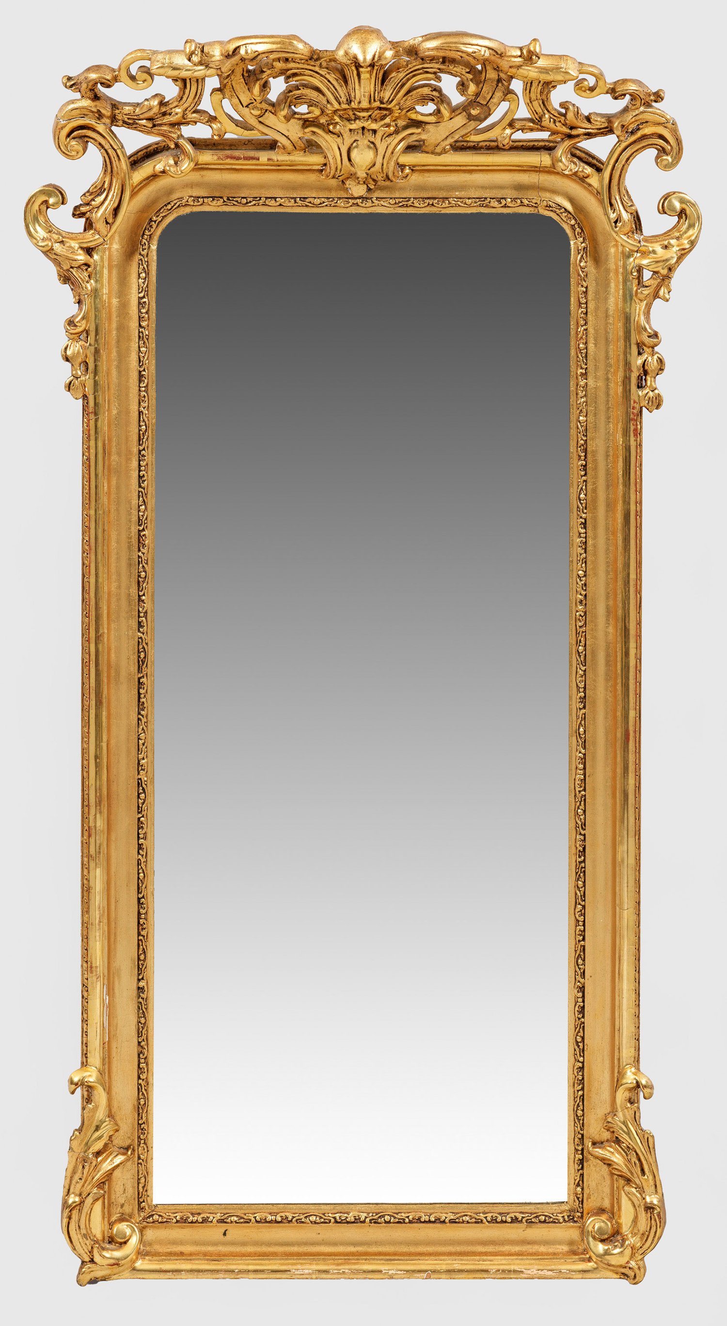 Holz, stuckiert und vergoldet. Hochrechteckige, umlaufend profilierte Spiegelrahmung mit gerundetem oberen Abschluss. Stark vorkragende, durchbrochen gearbeitete Bekrönung aus üppigen Volutenmotiven und Blattwerk. Fehlstellen. Besch. Spiegelglas. 142 cm x 77 cm.
