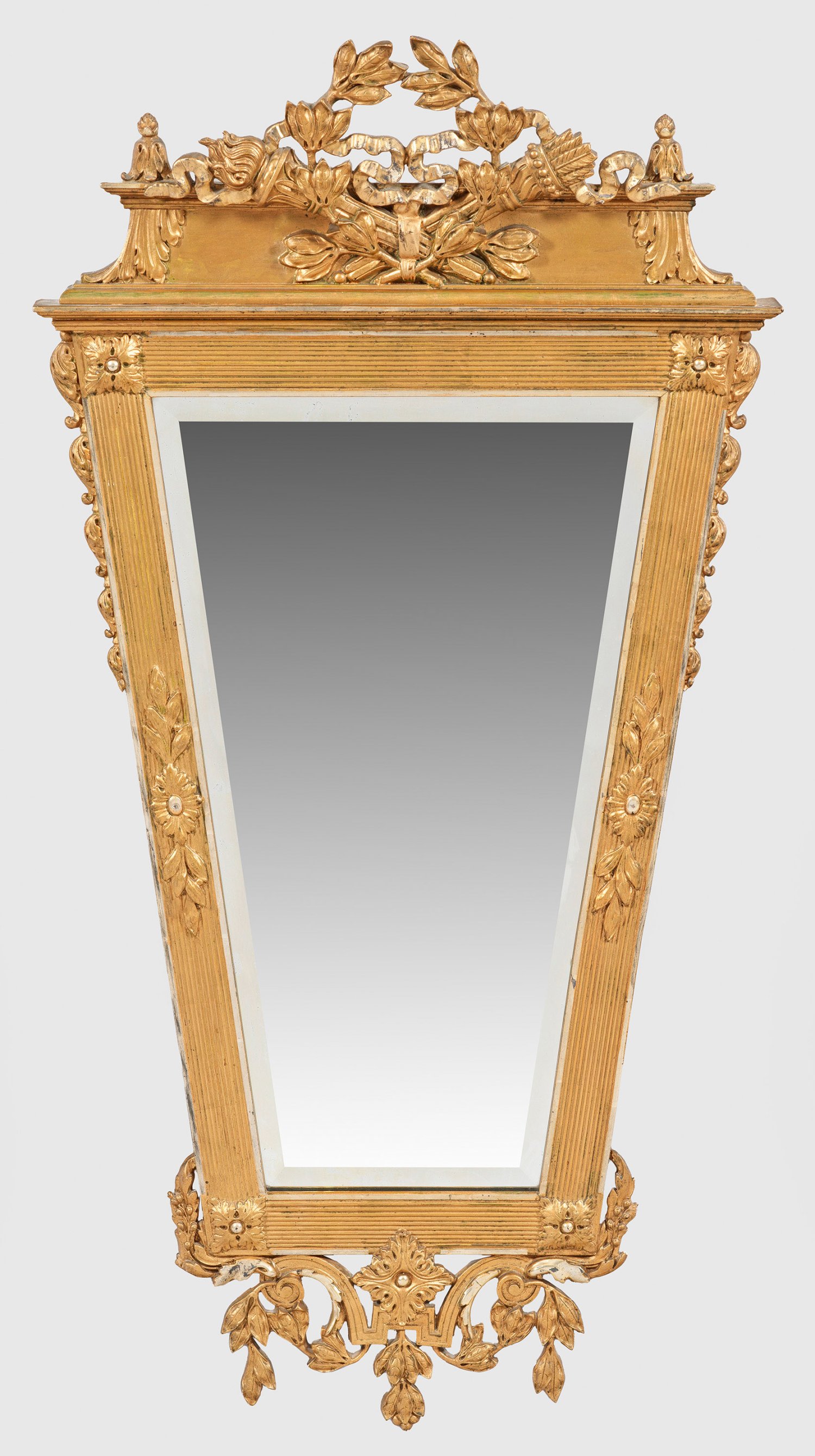 Holz, stuckiert, gefasst und vergoldet. Trapezförmige, fein godronierte Spiegelrahmung mit applizierten Blattmotiven. Durchbrochen gearbeitete Bekrönung aus Köcher- und Fackelmotiven sowie üppigen Blüten. Facettiertes Spiegelglas. Korrespondierender unterer Abschluss. 117 cm x 59 cm.