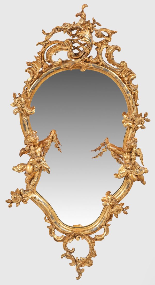 Holz, stuckiert, gefasst und vergoldet. Kartuschenförmige, asymmetrisch angelegte Spiegelrahmung, flankiert von plastisch gestalteten Puttenkindern. Durchbrochen gearbeitete Bekrönung aus üppigem Blattwerk und Rocaillen sowie korrespondierender unterer Abschluss. 115 cm x 58 cm.
