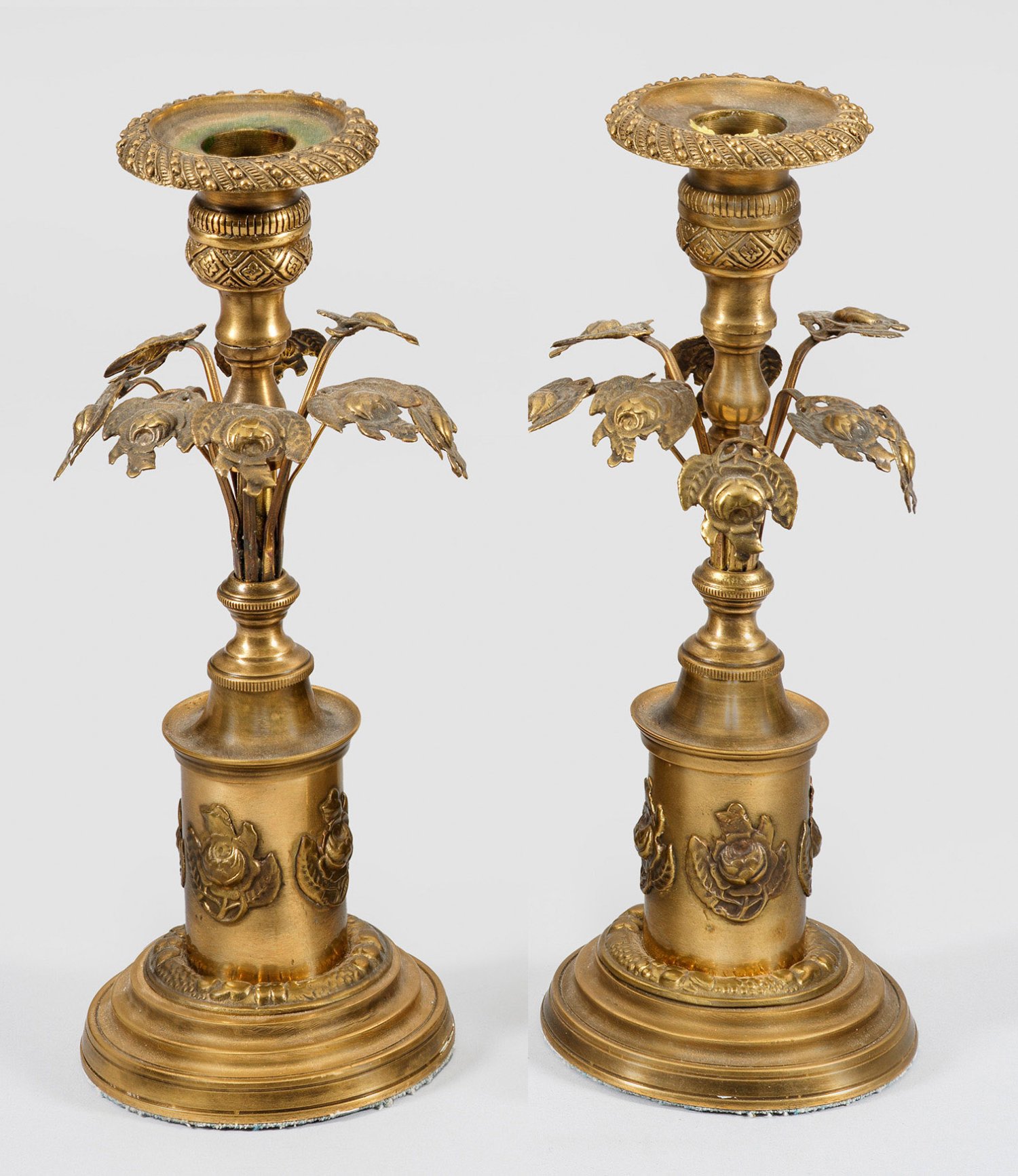A pair of French brass candlesticks.