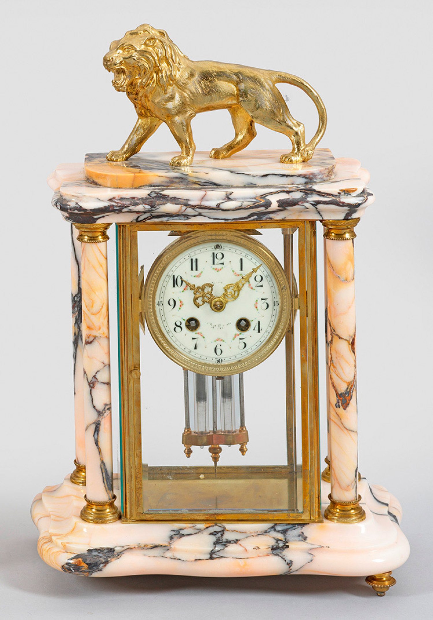 Cremefarben gemaserter Marmor. Über passig geschweiftem Profilsockel allseitig verglastes Gehäuse mit Löwenbekrönung, flankiert von eingestellten Säulen. Werk mit Pendelfeder sowie Halbstundenschlag auf Glocke. 1 Fuß fehlt. H. 42 cm. 28,5 cm x 15 cm,