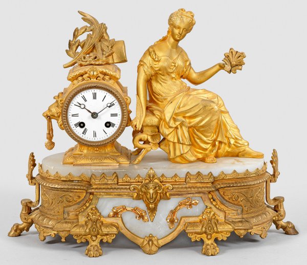 Zinkguss, vergoldet und Alabaster. Über reich dekoriertem Rundsockel auf Tatzenfüßen vollplastische Darstellung einer jungen sitzenden Dame. Balusterförmiges Uhrengehäuse, seitlich mit Löwenmaskaron. Emailzifferblatt sowie Pendulenwerk mit Pendelfeder und Halbstundenschlag auf Glocke. Besch.; Pendel fehlt. H. 34 cm. 43 cm x 13,5 cm.