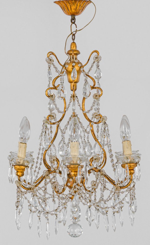 6-flg.; Metall und Holz, goldfarben lackiert sowie farbloses Glas. Balusterförmiger, offen gestalteter Korpus aus schmalen, geschwungenen Streben als Träger für Leuchtmittel. Reicher Behang aus facettierten Prismen und Prismenschnüren. Elektrifiziert. H. 75 cm. D. 46 cm.