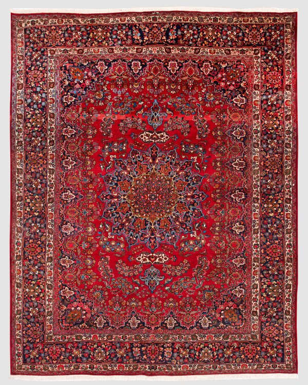 Persien. Wolle auf Baumwolle. Im roten Innenfeld großes Rundmedaillon mit Anhängern sowie breite Palmettenrahmung und Musterung aus Blütenzweigen. Umlaufend dunkelgrundige Bordüre, flankiert von schmalen Bändern. Kanten und Fransen erneuert. 301 cm x 380 cm.