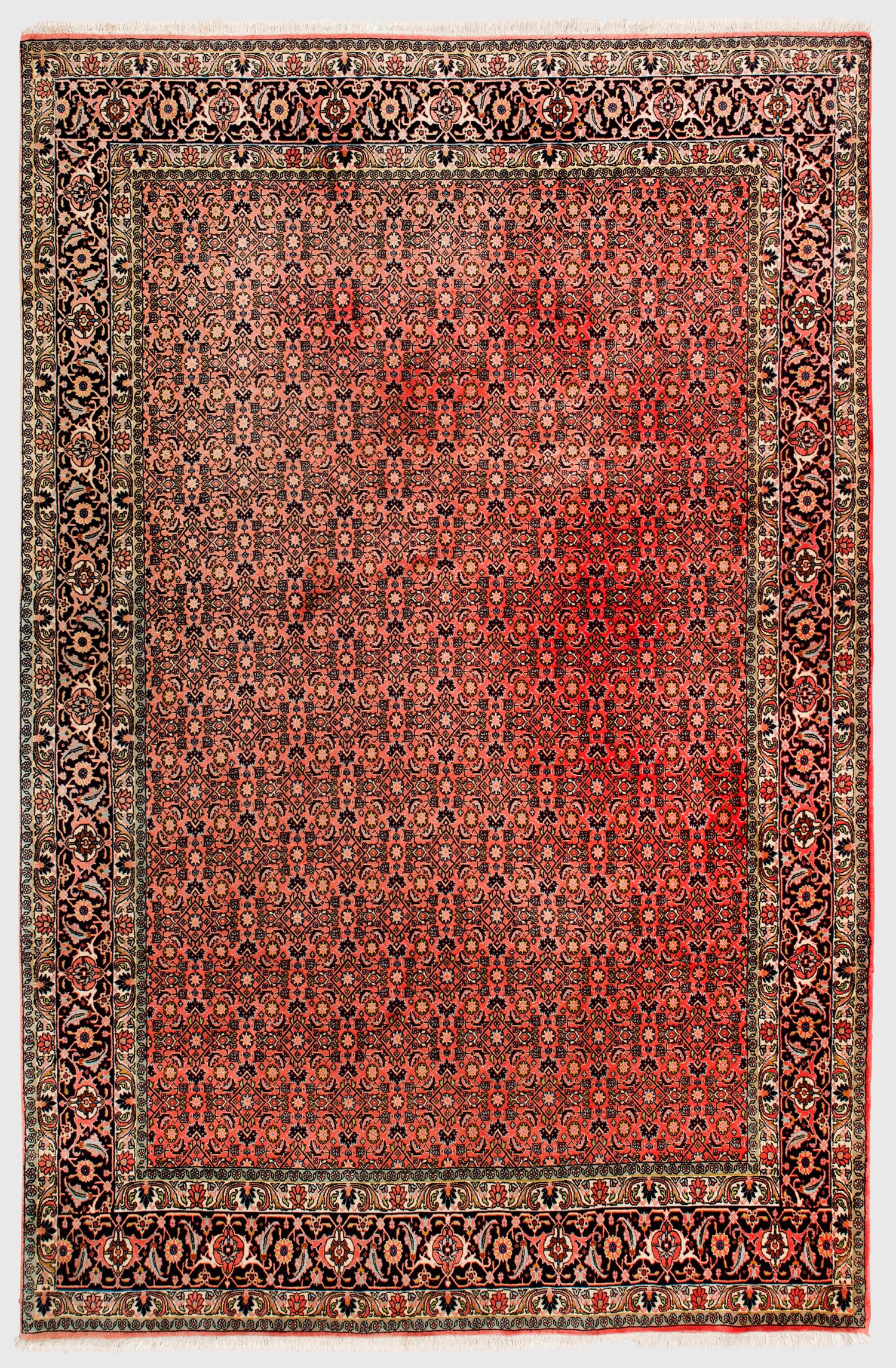 Persien. Wolle auf Baumwolle. Im roten Innenfeld flächendeckend durchlaufende Heratimusterung. Umlaufend breite, dunkelgrundige Bordüre aus Rankenwerk, begrenzt von schmalen Bändern. 200 cm x 305 cm.