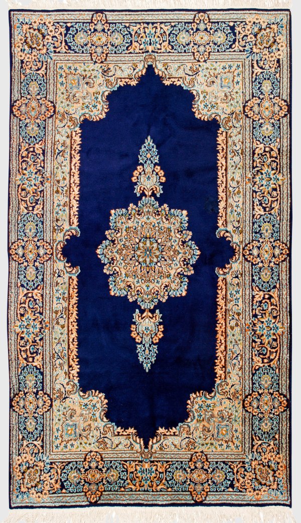 Persien. Wolle auf Baumwolle. Im monochromen, royalblauen Innenfeld großes Zentralmedaillon mit Anhängern sowie breite, passig geschweifte Rahmung. Umlaufend breite Bordüre aus kartuschenförmig angeordneten Blütenrispen. 208 cm x 157 cm.