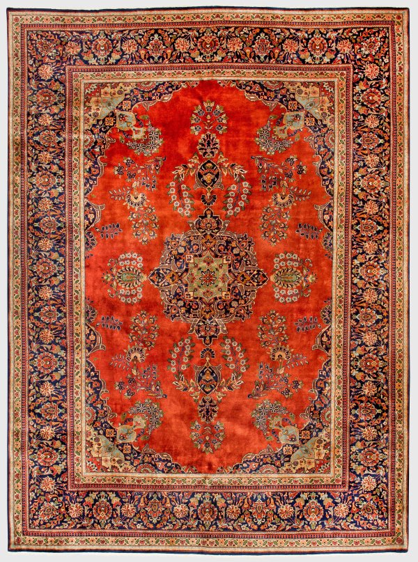 Wolle auf Baumwolle. Im hellroten, monochromen Innenfeld großes Zentralmedaillon sowie passig geschweifte Ecklösungen. Musterung aus großen, gestreuten Blütenzweigen. Umlaufend breite, dunkelgrundige Palmettenbordüre. 346 cm x 256 cm.
