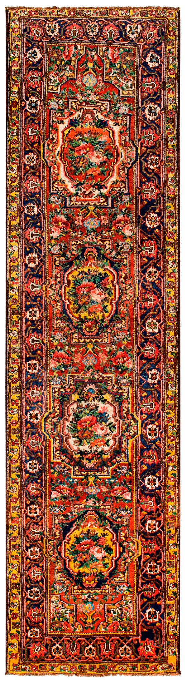 Persien. Um 1920-1930. Wolle auf Wolle. Im hellroten Innenfeld vier große Kartuschenmotive mit üppigem Blütendekor sowie korrespondierende Musterung. Umlaufend dunkelgrundige Bordüre aus stilisierten Palmettenranken. 407 cm x 107 cm.