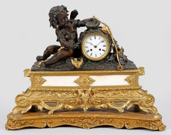 Zinkguss, teilw. dunkel patiniert sowie weißer Marmor und Holz, vergoldet. Querrechteckig angelegter Korpus auf üppigen Volutenmotiven. Oberhalb vollplastisch gestalteter Amor sowie rundes Uhrengehäuse. Verglastes Zifferblatt, undeutl. bez.; Pendulenwerk mit Fadenaufhängung sowie Schlagwerk auf Glocke. Pendel fehlt. H. 51 cm. 64 cm x 22 cm.